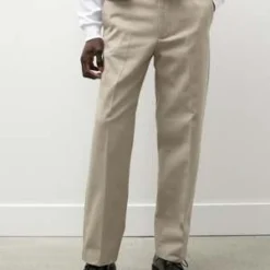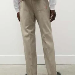 Flat front, trousers with a slim straight leg, cut from a mid weight textured cotton twill in a medium beige. Feature front slash pockets, a single rear patch pocket at the right side, a long rise, and six belt loops at the waist. Leg is creased lending a sense of formality to an otherwise casual seeming fabric. Finished with a blind hem that can be let out if added length is desired.