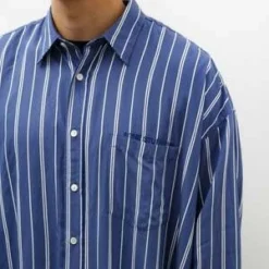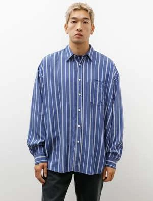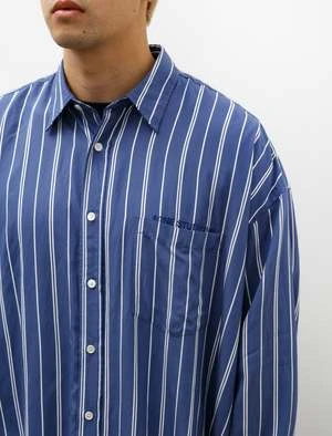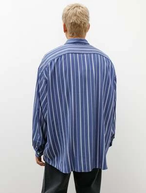 An oversized button front shirt cut from a super light viscose twill with a subtle lustre in a blue and white stripe. Features a classic collar, a left breast pocket with semi-concealed logo embroidery at the opening, a clean finished back yoke with pleats at the shoulder, and a locker loop at the exterior back neck. Generous in proportion, this shirt’s volume creates dynamic movement that is accentuated by the shimmer of the weave in changing light. Constructed with flat felled seams throughout for a long lasting finish that is at once highly durable and elegant at the interior; mother of pearl buttons, curved hem.