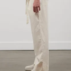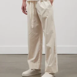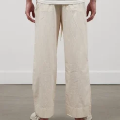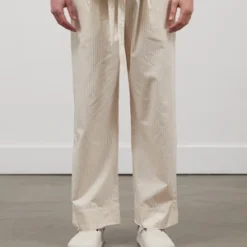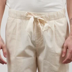 The first collaboration between Birkenstock 1774 and Copenhagen-based bedding label Tekla, the Wheat Stripe Pants are a cotton poplin trouser with a drawstring waistband, shown here in a fine sand and white stripe. Equally suited to daily lounge wear or elevated summer trouser, the pants have a mid rise, elastic waistband, front darts, side slip pockets, rear patch pockets and a mother of pearl button fly. Crafted from 100% organic cotton. Manufactured in Portugal. Model is 192cm and wears a size Medium.