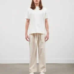 The first collaboration between Birkenstock 1774 and Copenhagen-based bedding label Tekla, the Wheat Stripe Pants are a cotton poplin trouser with a drawstring waistband, shown here in a fine sand and white stripe. Equally suited to daily lounge wear or elevated summer trouser, the pants have a mid rise, elastic waistband, front darts, side slip pockets, rear patch pockets and a mother of pearl button fly. Crafted from 100% organic cotton. Manufactured in Portugal. Model is 192cm and wears a size Medium.
