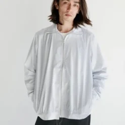 This track jacket is made from luxurious striped shirting fabric with subtle herringbone detail. The YKK zipper features Fortgens’ signature unfinished stitching and when closed highlights the uneven hemline. There is also a nod to traditional shirting with the C.F. monogram detailing on the left cuff; another example of his restrained playfulness.