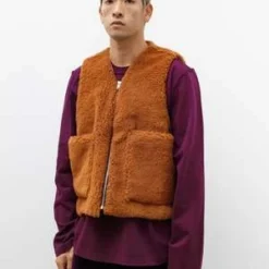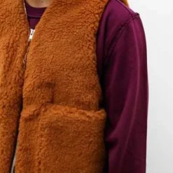 A boxy, slightly oversized zip front vest cut from a natural wool fleece in a warm caramel brown. Features a collarless neckline, a custom brown wire zipper pull, patch pockets at the waist, and Camiel’s signature deconstructed styling with loose threads throughout. Cut as a continuous, single piece with no side seams, the body drapes exceptionally well from the shoulders and has no excessive seam bulk. Finished with a full lining in a natural cotton muslin for improved next to skin comfort.