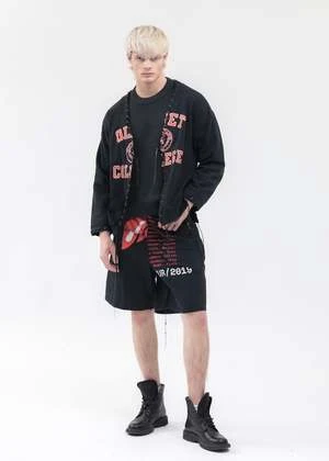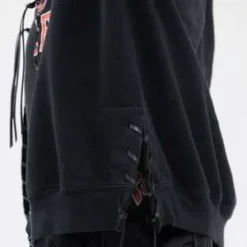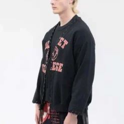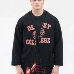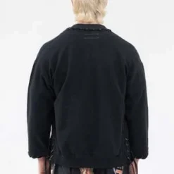 1 of 1 reconstructed vintage college sweatshirt sweater, featuring vintage college sweaters that have been deconstructed and reconstructed into a relaxed fitting sweater held together with leather tape stitching and tie strings to attach it in the middle.