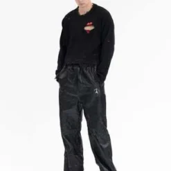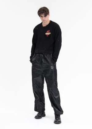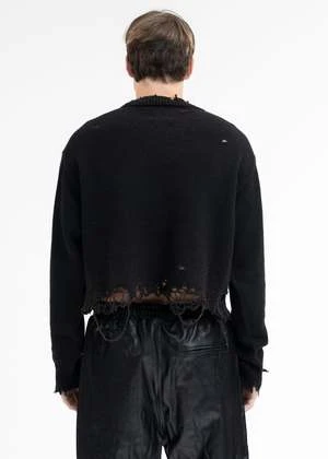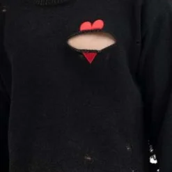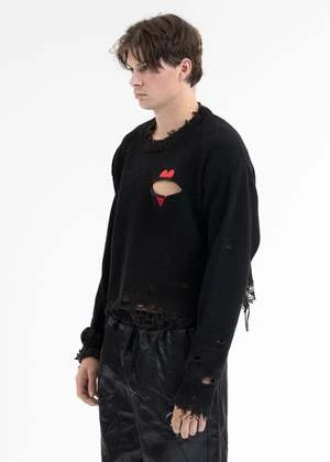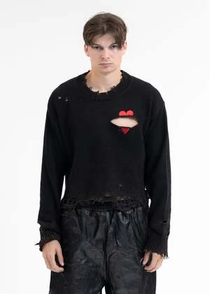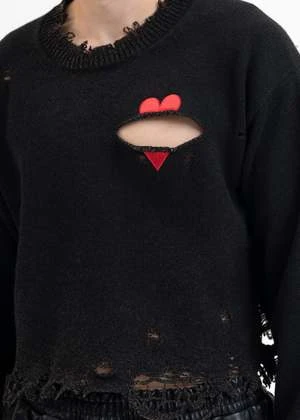 Broken heart knit pullover sweater in black, from Doublet. Features a cropped relaxed construction with dropped shoulders, a distressed rib-knit crew neck collar, and distressing along the cuffs and hem. Red heart graphic with large hole detailing at the left chest. Finished with tonal stitching and loose thread detailing throughout.