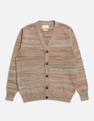 The Buckley Cardigan is a classic V-neck style made from multicoloured twisted yarns. It featured ribbed trims and corozo nut buttons at the front.