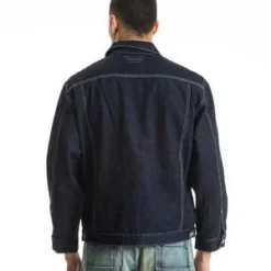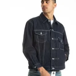 Denim Jacket Rinse in indigo by FDMTL. A combination of Type II and Type III denim jackets fill the front, and adjustable waist tabs are featured at the sides.