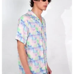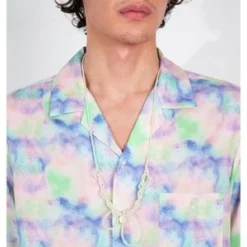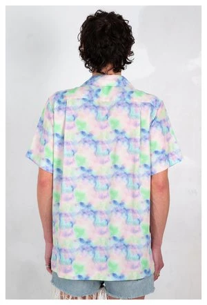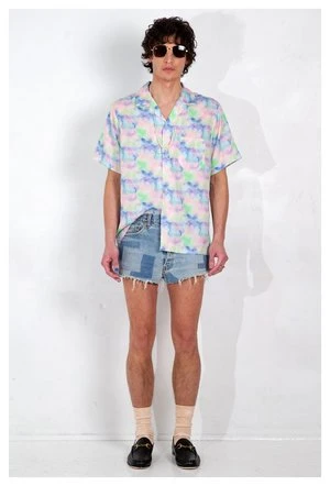 The “Desi” camp collar shirt is given a modern twist, cut in a soft Tencel poplin printed with a colorful dreamy swirl pattern, evoking the mood of classic Dream Pop records.