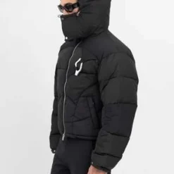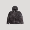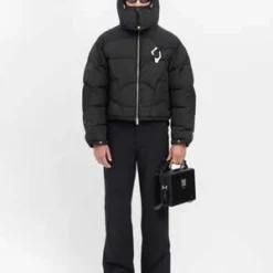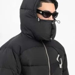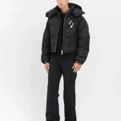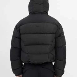Abstract down puffer in black, from Heliot Emil. Relaxed symmetrically quilted down jacket with slightly dropped shoulders, a puff hood with elasticized cinch lock fastening, and silver-tone hardware throughout. Silver-tone carabiner at the left chest. Finished with tonal stitching throughout.