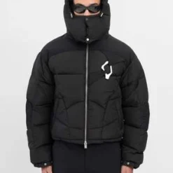 Abstract down puffer in black, from Heliot Emil. Relaxed symmetrically quilted down jacket with slightly dropped shoulders, a puff hood with elasticized cinch lock fastening, and silver-tone hardware throughout. Silver-tone carabiner at the left chest. Finished with tonal stitching throughout.