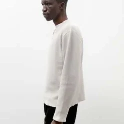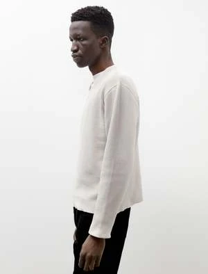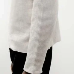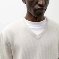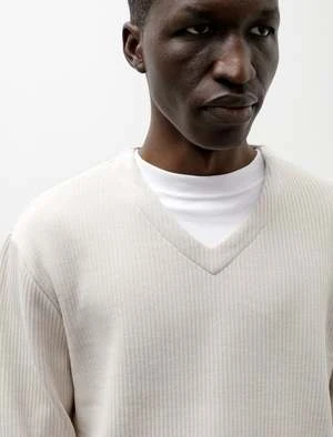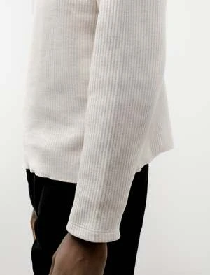 Sewn by Lady White Co’s sample team in their studio, this boxy v-neck sweater is constructed from a rib knit cotton with a jersey backing. The neckline is finished with a tonal jersey-facing, serged hem.