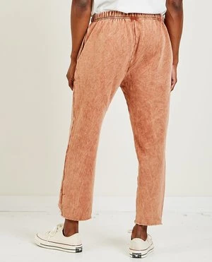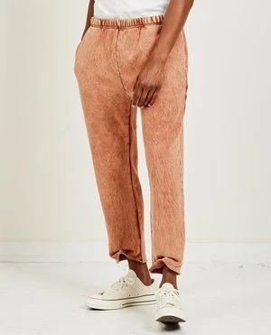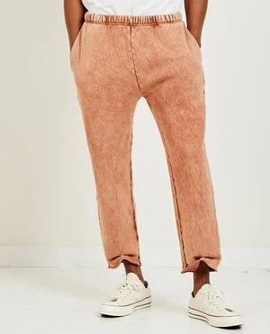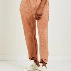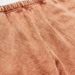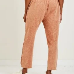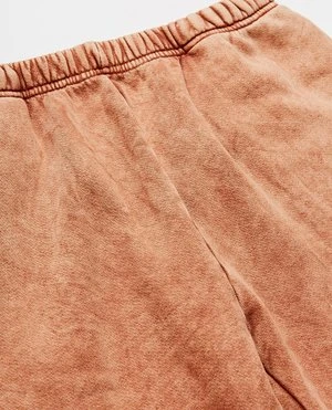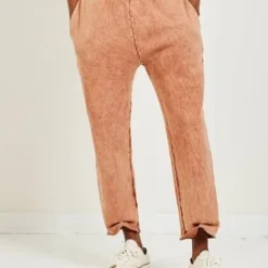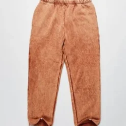 Snap front pant in mahogany by Les Tien. A vintage textured heavyweight fleece. Each piece is rubbed with a steel brush to produce a vintage look and feel. 1.5″ double-stitched elasticized waistband, braided cotton drawstrings, deep side seam pockets, and Reverse outer stitching with frayed bottom detail.