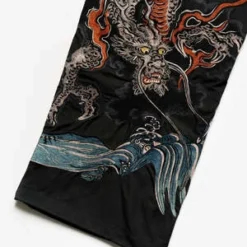 Loose fit black Cargo Original Snopants, cut from a organic cotton / recycled polyester blend. Features artwork by Utagawa Kuniyoshi as an intricate Dragon and Waves embroidery at the leg, Snocords allow for a fully adjustable waist and hem, whilst darts at the knee provide an articulated shape for a free range of motion.