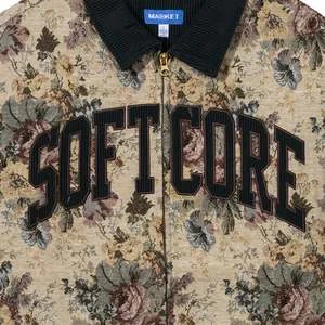 This heavyweight jacket is perfect for the colder weather. Made of a sturdy tapestry fabrics with a corduroy a collar, a two-way zipper and embroidered-appliqued text. An easy cop from our Fall 23 collection.
