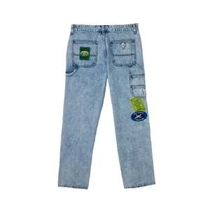 Jeans by GUESS ORIGINALS and Market with an acid wash effect and topped with logo patches throughout. Carpenter style pants with a straight leg silhouette and utility style pockets & hammer loop accent. Mid-rise waist with a zip fly and button closure.