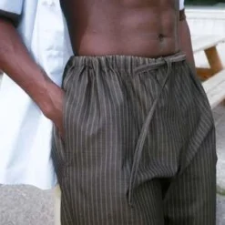 Ease of wear and versatility~ the Yosemite Pant is a unisex style bottom with a relaxed fit and adjustable drawstring closure around the waist. Side seam invisible pockets. Featured in high quality, ultra leightwight grey wool pinstripe.