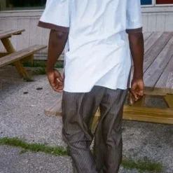 Valentine is 6′ and wears with the Rex Tee in Zephyr.