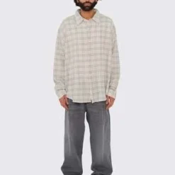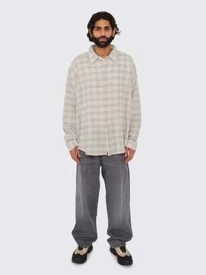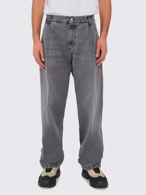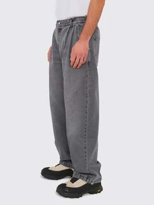 The Big Jeans from Mfpen are crafted from a washed grey organic cotton fabric. These double pleated washed denim trousers feature front and back creases, two side pockets, and back patch pockets. The trousers are closed with a button closure and feature a YKK zip fly. A signature fabric patch detail on the waist belt completes the look.