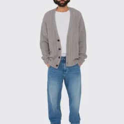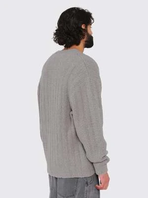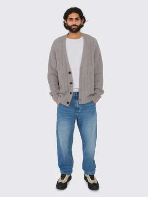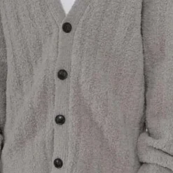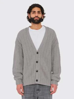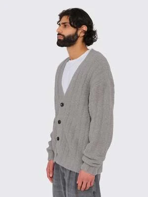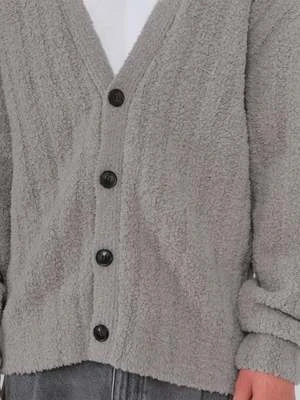 This cardigan is crafted from a curly Italian wool blend yarn, expertly knitted in a rib pattern. The yarn is a combination of both virgin and recycled wool, as well as nylon, creating a soft, luxurious feel. The design is complete with dark brown buttons and ribbed detailing at the hem and sleeve cuffs.