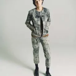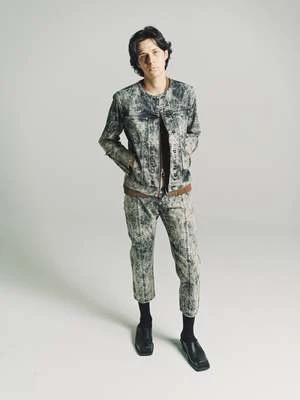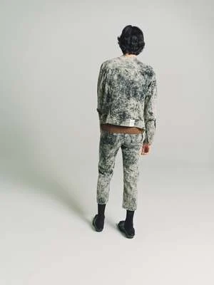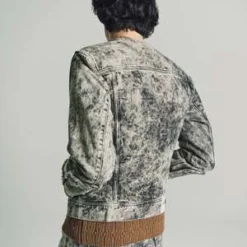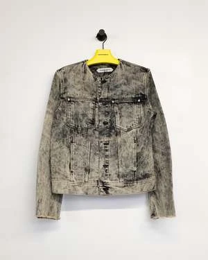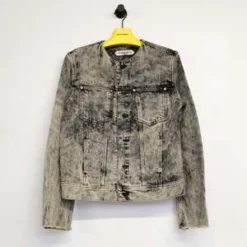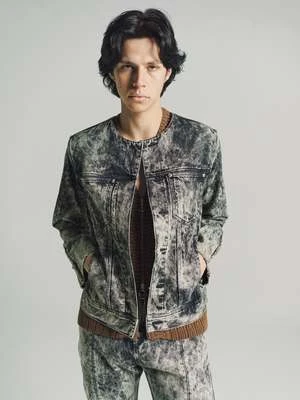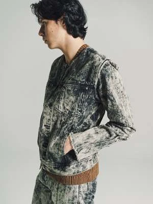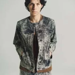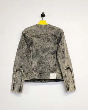 Collarless tapered denim jacket, hook & eye closure and panelled sleeve detailing with cusutom Namacheko single sphere rivets. New seasonal wash, sky magic creating a texture cloud effect in contrast colours.
