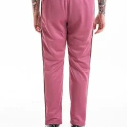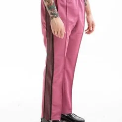 Narrow Track Pant in pink by Needles. Features an elastic waistband, narrow track pants in a new color from the standard track series. The points are the 5 lines that are the brand icon and the butterfly embroidery.