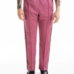 Narrow Track Pant in pink by Needles. Features an elastic waistband, narrow track pants in a new color from the standard track series. The points are the 5 lines that are the brand icon and the butterfly embroidery.