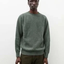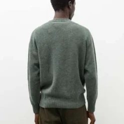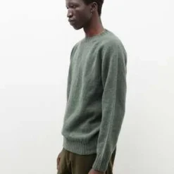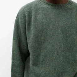 Our classic recurring Shetland sweaters knit by Harley of Scotland with pure new wool in a rich green melange yarn. Fair Isle stitching provides an exceptional warmth to weight ratio, incorporating more insulative properties without the need for excessive bulk. Relaxed through the body and sleeves, they create an easy silhouette with soft draping that is incorporated into layering. Knit using full fashion construction, to eliminate all seams creating a smooth interior that is incredibly wearable; completed with a ribbed neckline, ribbed hem, and ribbed cuffs.