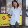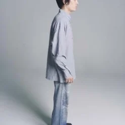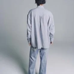 Our Borrowed Shirt in Mid Blue Burlington Seersucker. Produced in an Italian cotton and linen blend seersucker fabric, the mens Borrowed Shirt has a wide oversized cut and features mother of pearl buttons, a single chest pocket, mitered cuffs, an OL embroidered logo and a curved hem.