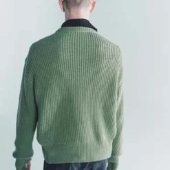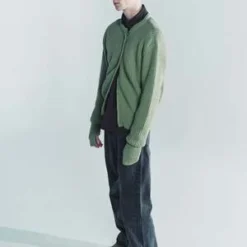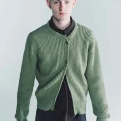 Our Zip Wrap Cardigan in Refined Green Quotidian Wool. Produced in an Italian virgin wool fabric with a ribbed texture, Inspired by a Swedish zipped army knit from the 80s, the mens Zip Wrap Cardigan has a relaxed, straight fit and can be closed in the middle with zip or buttoned across the body. Sleeves are slightly elongated and feature a thumb hole to help hands keep warmth. The cardigan features horn buttons and a round collar. This garment is manufactured using a carefully sourced yarn. The natural characteristics of the yarn, combined with the construction of the knit allows the garment to expand when worn. The garment shall be shaped by its wearer and naturally distress over time to finish the design process. To help keep the integrity of the garment please store the garment folded.