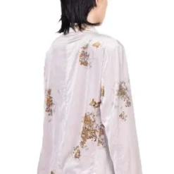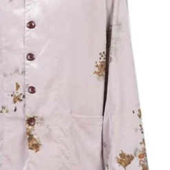 Long sleeves. Button closure at front. Two side pockets. Soft velvet fabric. Medicinal print throughout. Leather buttons details throughout.