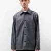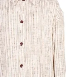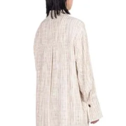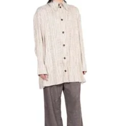Long sleeves. Button closure at front. Leather buttons. Pleats at back. Beautiful yard dyed fabric. Button at cuffs. Long fit.