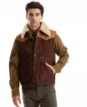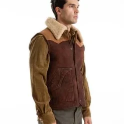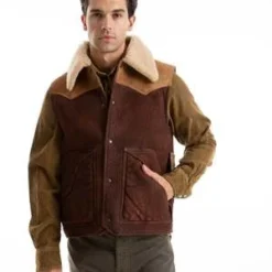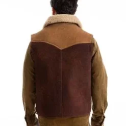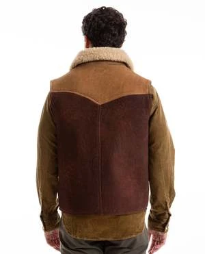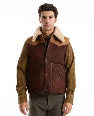 Dalton Shearlng Vest in brown by RRL. This vest is made from waxed and vintage treated leather with a two-tone exterior. It features two patch hand warmer pockets.
