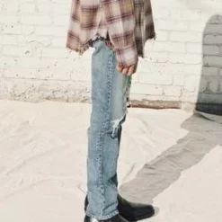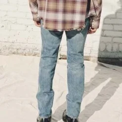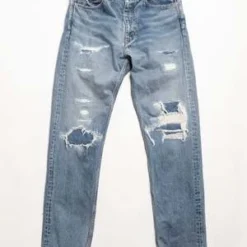 Relaxed Fit Grunge Denim with destroyed holes and repair details, flat and logo original rivets produced by END CUSTOM JEWELLERS are used for the front and back pocket sides. The fabric is 13oz uneven thread denim, which is not bleached at once with a bleaching agent, but is slowly discolored with stone wash, shaving gives a beard look, and further wash is applied to create a denim with a more vintage look